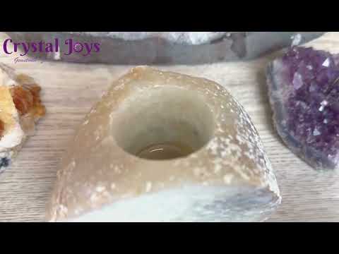 The agate geode candle holders have a polished face with beautiful banding and quartz veins. The top has been drilled to fit a range of candle sizes, making it a beautiful accent to your home décor collection. The natural candle holder is 4-6" in length and 4-6" in width. Agate is a rock consisting primarily of cryptocrystalline silica. Agate is characterized by its fineness of grain and variety of colors. Agates are classically associated with volcanic rocks and can be common in certain metamorphic rocks. Agate is thought to increase inner stability, composure, and maturity, and help with protection.