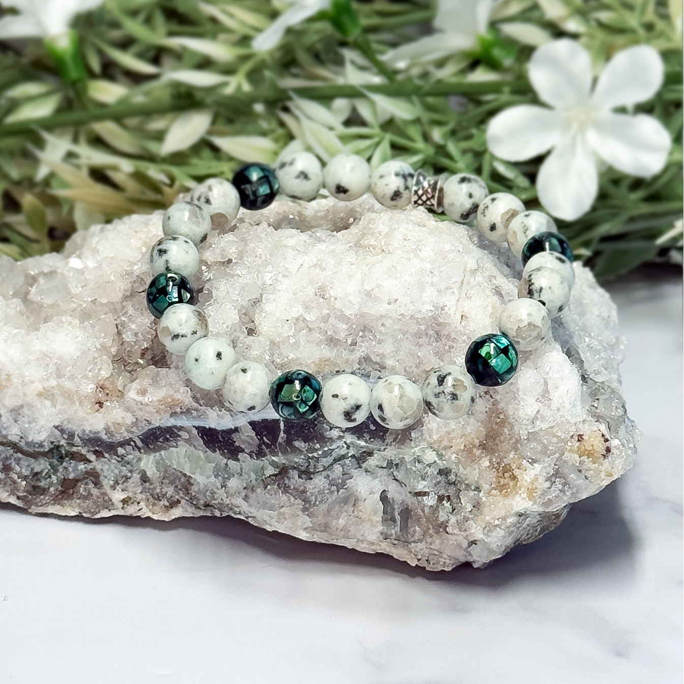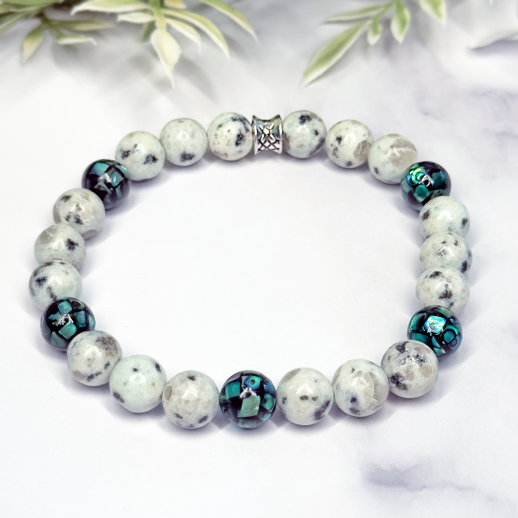 Earthy with a luminous coastal touch, the Green Abalone Shell Mosaic & Kiwi Jasper Stretch Bracelet blends natural texture with organic beauty. This artisan-made bracelet features shimmering green abalone shell mosaic pieces paired with smooth kiwi jasper beads, creating a striking contrast of iridescence and grounding earth tones. Set on a comfortable stretch cord with silver-plated brass accents, this bracelet is designed for easy everyday wear while adding a unique, nature-inspired statement to any look.