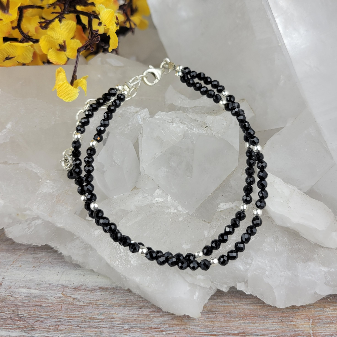 Our Double Strand Beaded Black Spinel with sterling silver is a captivating blend of elegance and timeless beauty. This exquisite piece of jewelry is meticulously crafted to adorn your wrist with unparalleled grace and style. The faceted gemstones have sterling silver beads added throughout to enhance the sparkle and beauty.