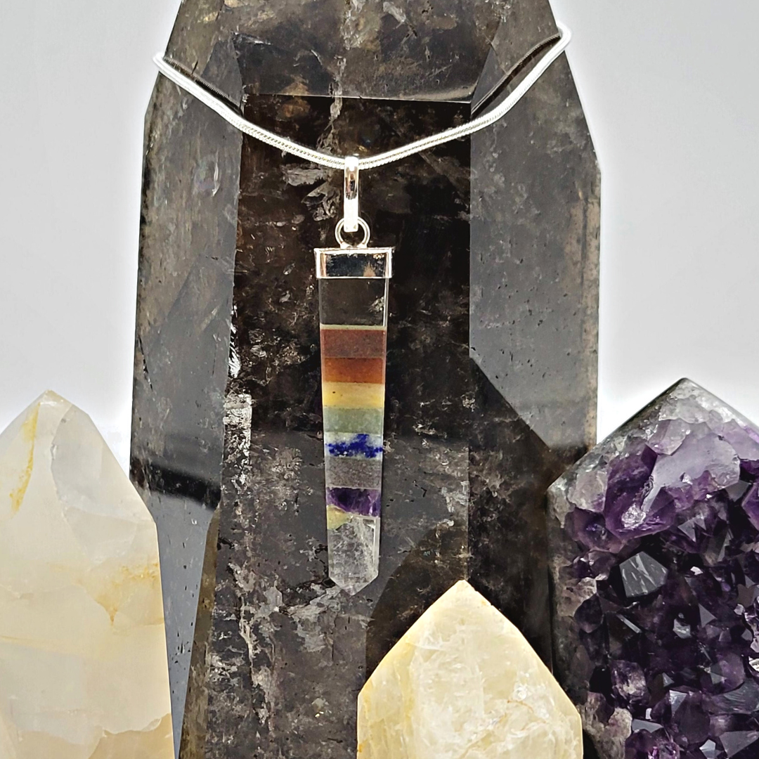 This polished point pendant combines gemstones that correlate to the seven chakras. It includes Red Jasper, Carnelian, Citrine, Aventurine, Lapis, Iolite, and Amethyst. It is believed that wearing or carrying all chakra stones helps to balance the energy centers of the body.