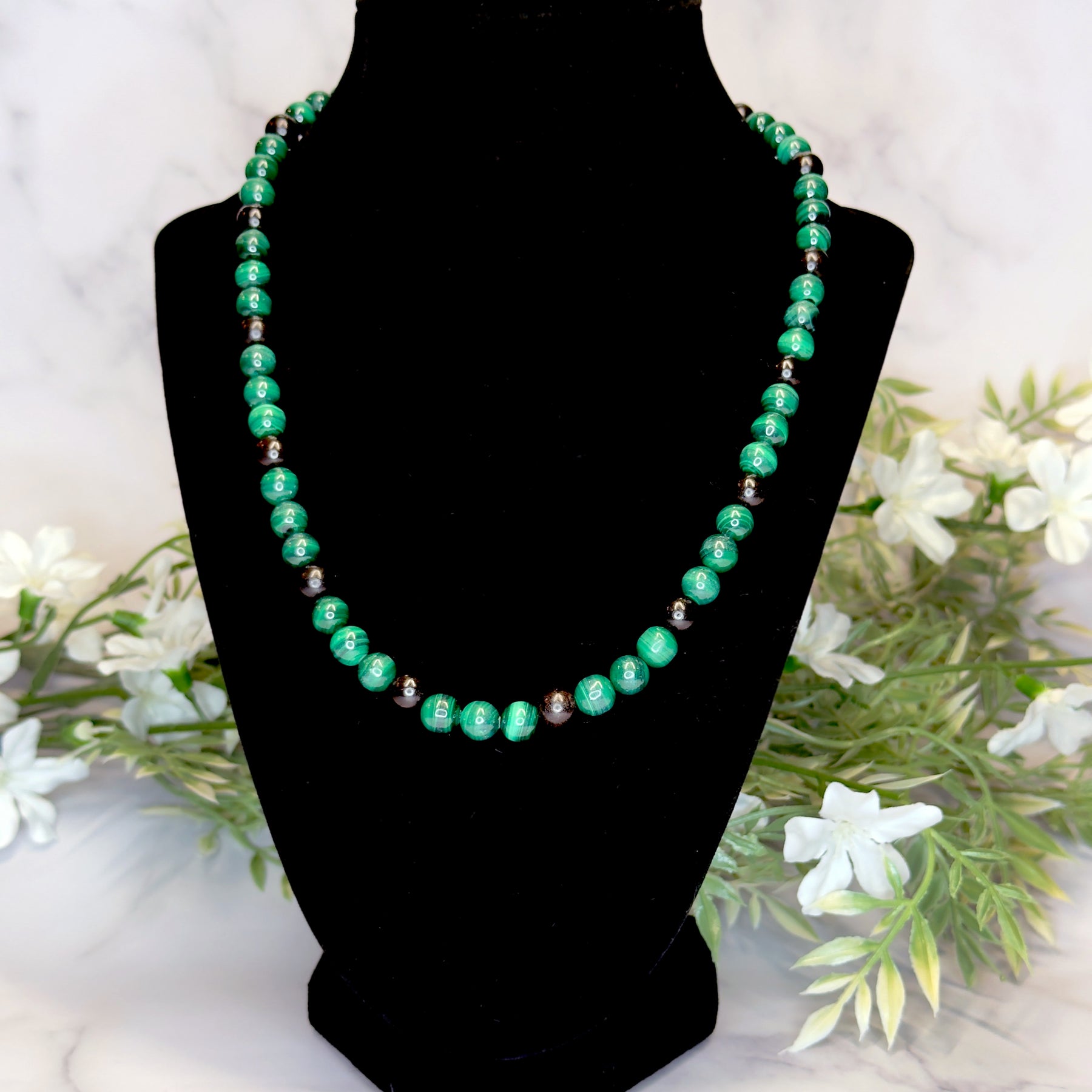 The Malachite and Ebony Wood Necklace combines rich natural contrast with timeless, earthy elegance. AAA-grade malachite beads showcase deep green banding and vibrant color, beautifully paired with smooth ebony wood beads for an organic, grounded look. Hand-strung and finished with silver-plated brass and pewter components, this 8mm beaded necklace offers a refined, artisan-made style with a touch of bold sophistication.