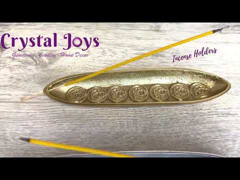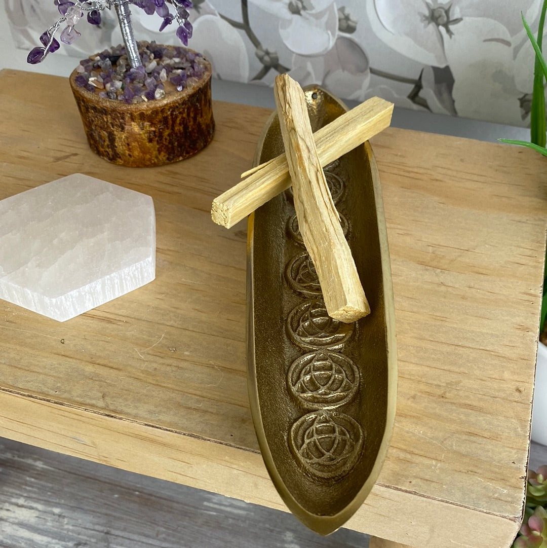 This gold toned metal plated incense stick holder comes in the shape of a boat and has raised details of Celtic Trinity Knots.