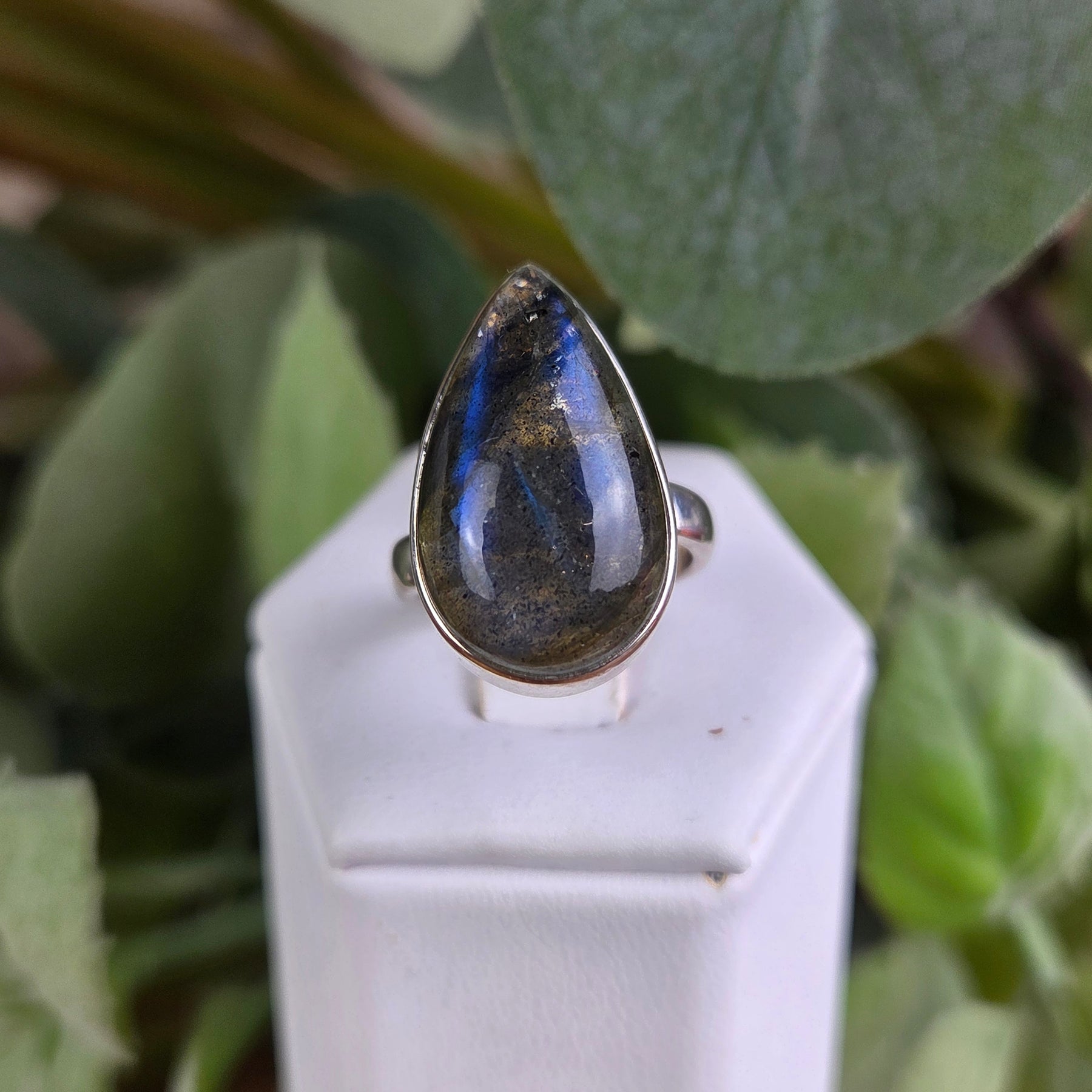 This Labradorite Polished Ring features a captivating natural labradorite gemstone set in a sterling silver adjustable band. Each stone displays flashes of blue, green, or gold—thanks to its natural labradorescence—and is polished to highlight its unique color and energy. The freeform oval or round-cut stone measures approximately 1 inch, though each ring will vary slightly in shape, size, and hue.