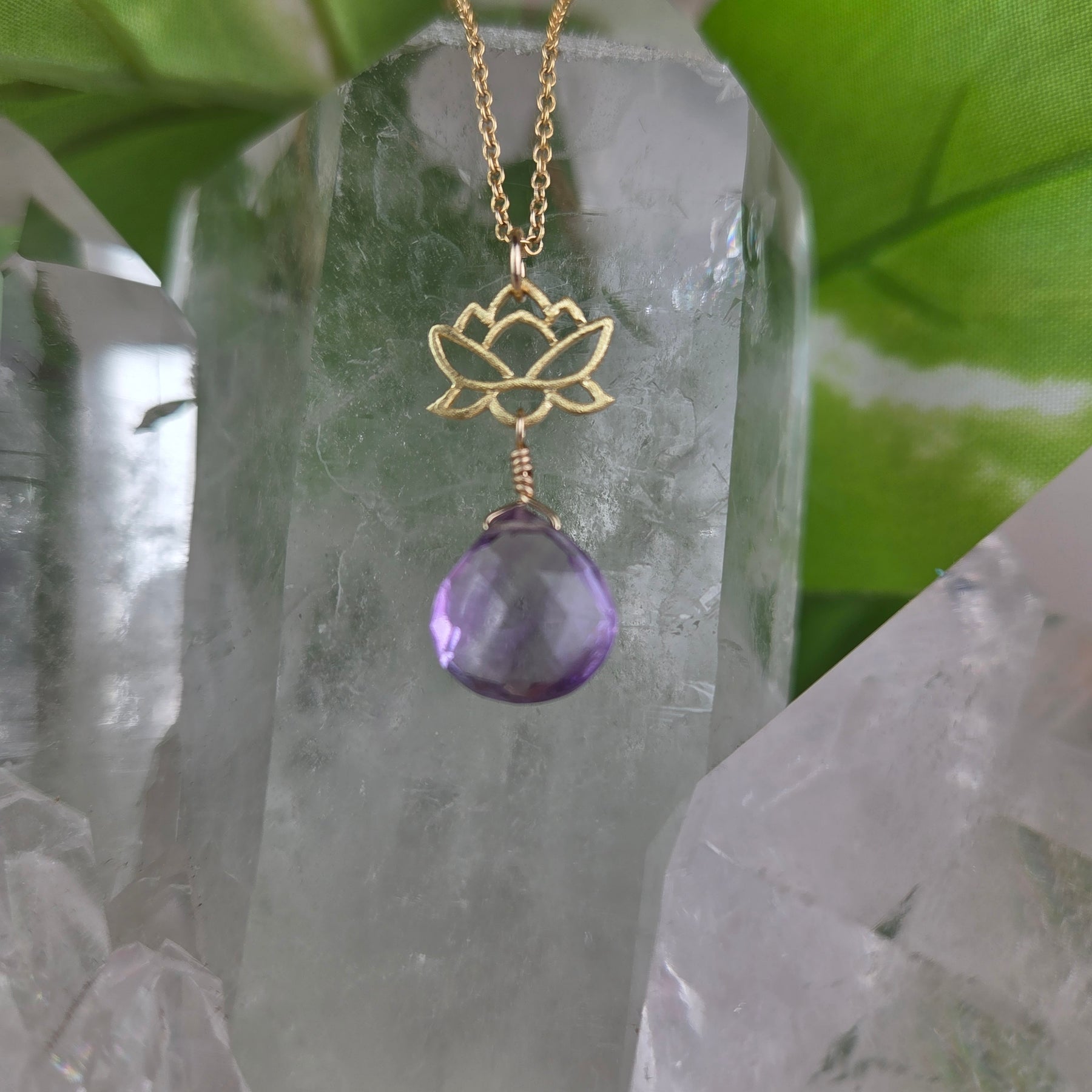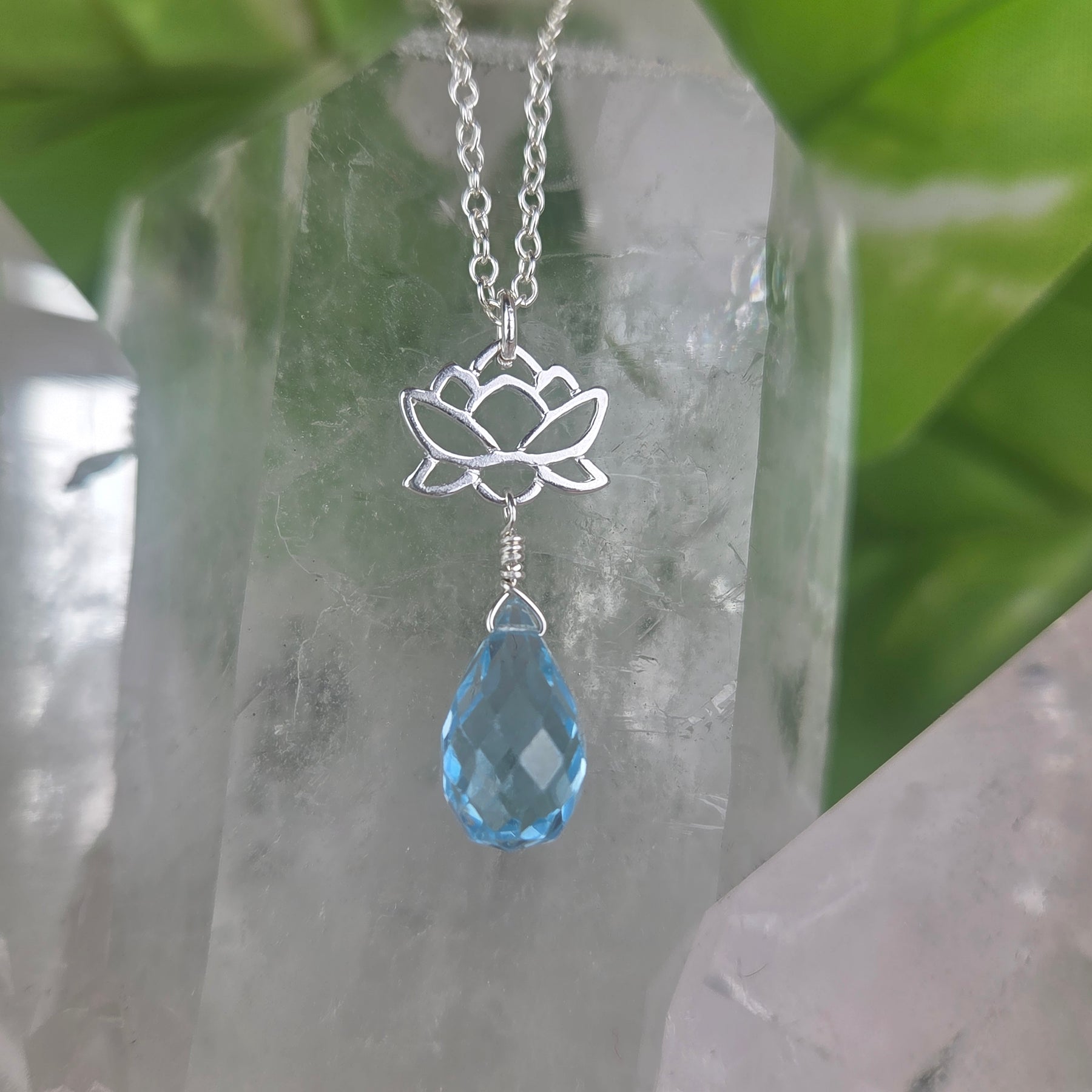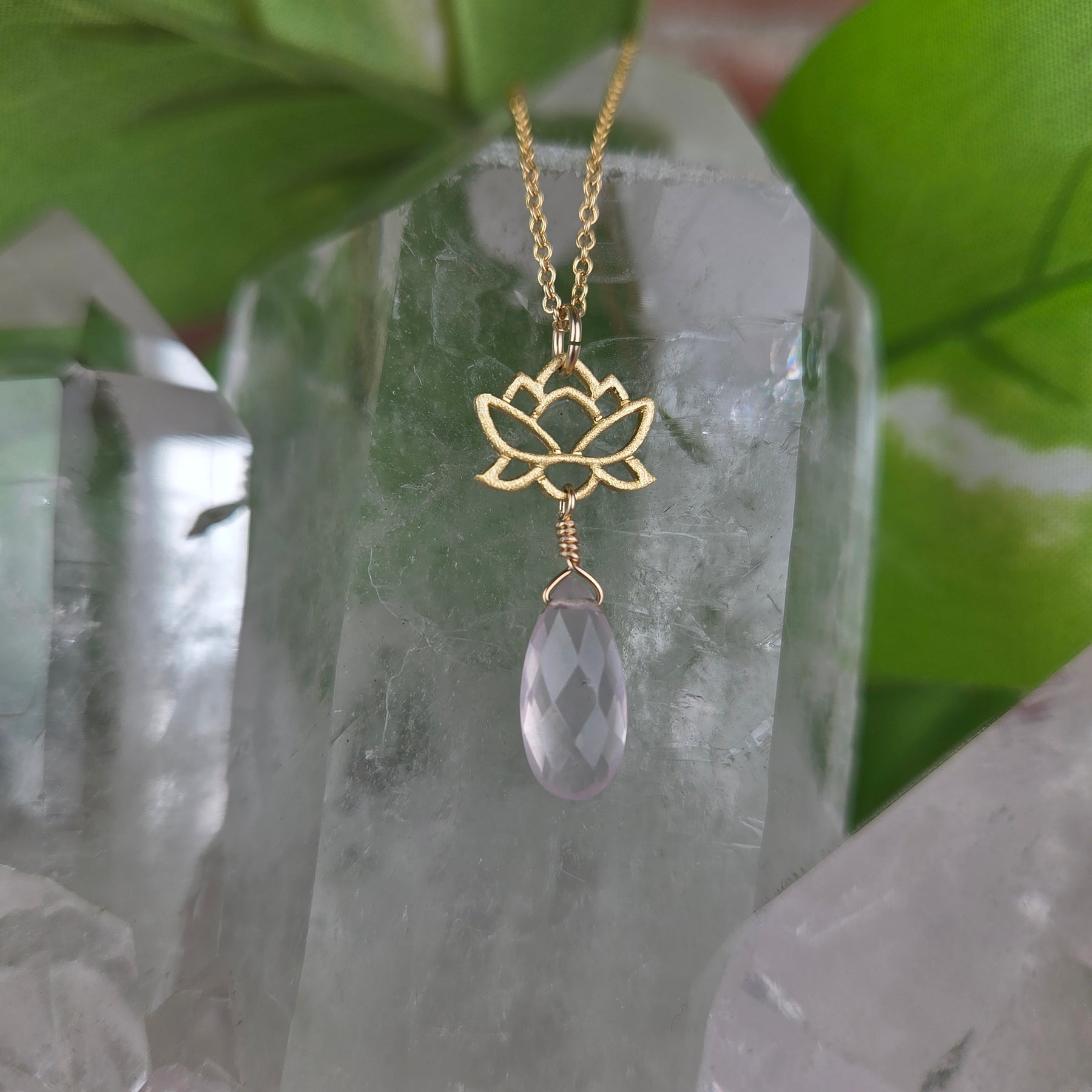 Small Lotus Flower Necklace with Gemstone Briolette is an artisan-made piece designed with simplicity, meaning, and everyday wear in mind. Featuring a delicate lotus charm paired with a shimmering gemstone briolette, each variation offers its own subtle color and character. Available in both sterling silver and gold fill, this necklace is finished with coordinating chain, clasp, and findings for a cohesive, refined look.
