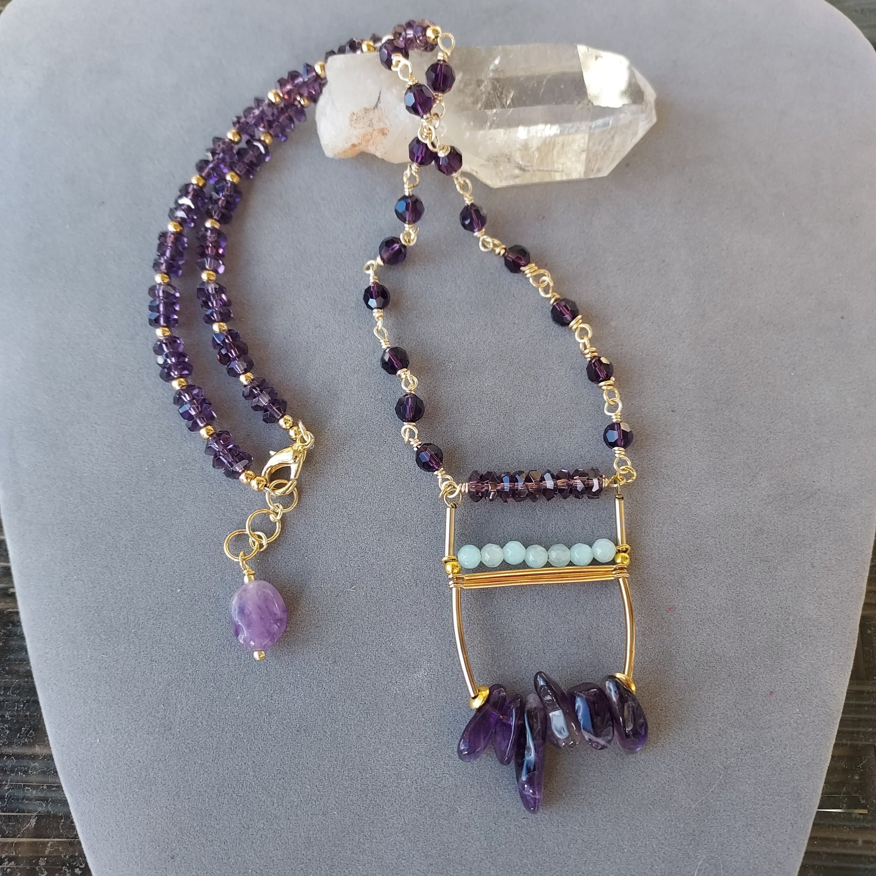 Amethyst has long been associated with calm, clarity, protection, and wisdom, while crystal accents are often believed to amplify light and energetic flow—making this artisan-made necklace a thoughtful piece for everyday wear or intentional layering.