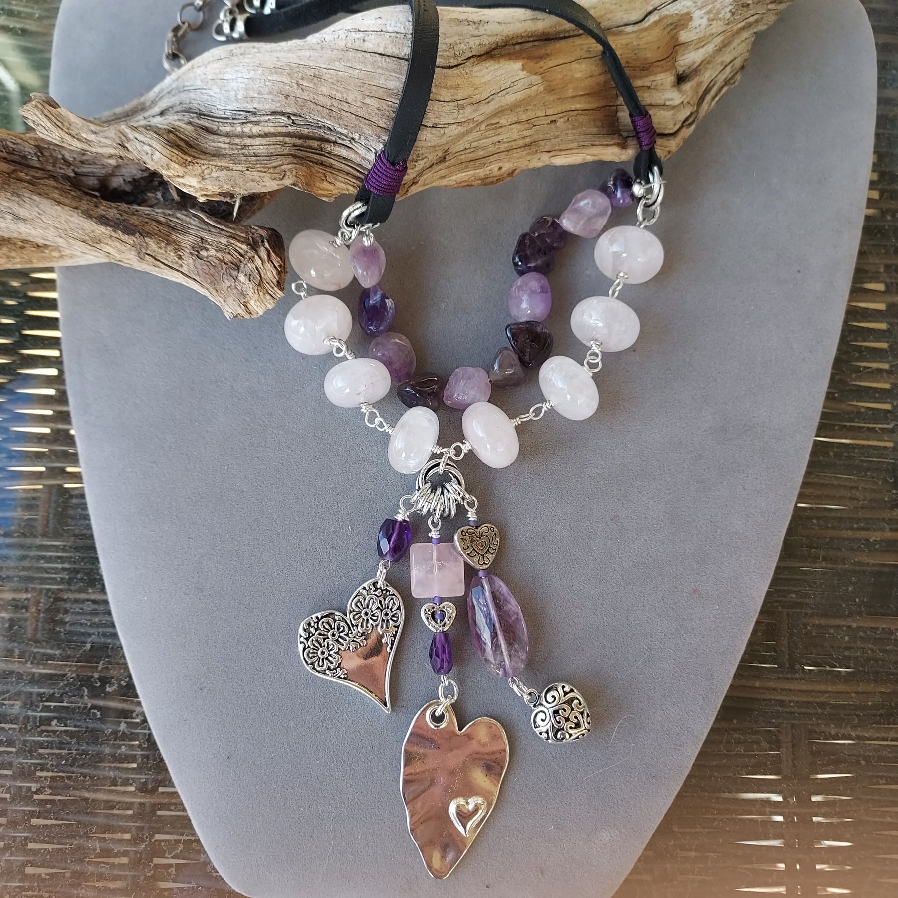 Designed to honor connection and calm, “Stones of Love & Peace” Hearts, Rose Quartz & Amethyst Necklace brings together heart symbolism and two stones long associated with emotional balance. Wire-wrapped Rose Quartz rondelles and a faceted square are paired with Amethyst nuggets and faceted ovals, accented by assorted silver-plated heart charms for gentle movement and meaning. Finished on a black suede cord with silk wrap detailing, this artisan-made necklace features an antique silver lobster clasp, chain extender, and an Amethyst nugget drop for an adjustable, layered look.