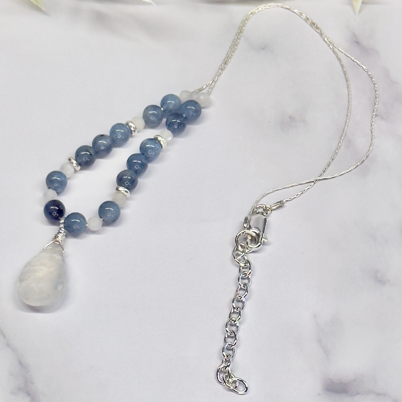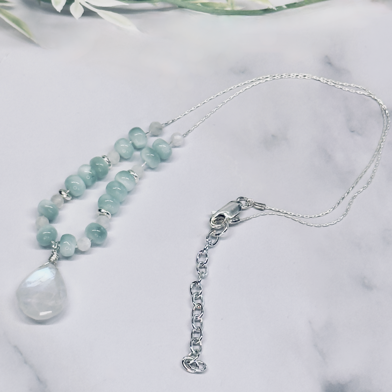Soft glow and delicate movement define the Teardrop Moonstone Sterling Silver Necklace with Accent Stones – Artisan Made. A luminous rainbow moonstone teardrop takes center stage, complemented by coordinating accent stones that add subtle color and depth. Sterling silver wire and chain create a refined, lightweight feel, while silver plated rondel beads and an extender chain allow for easy layering and adjustable styling. Each handcrafted piece offers its own gentle shimmer and one-of-a-kind character.
