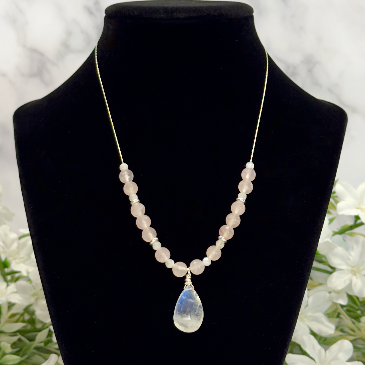 • Rainbow Moonstone with Rose Quartz accent stones