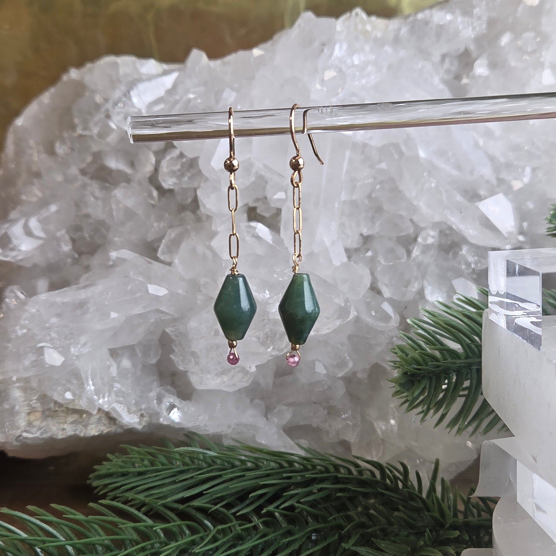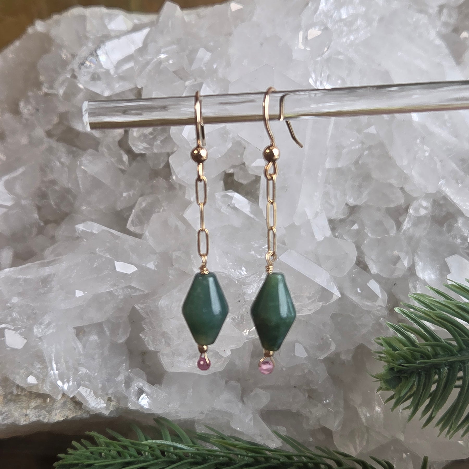 The Moss Agate and Ruby Paperclip Dangle Earrings – Artisan Made are perfect for those drawn to jewelry that blends modern design with natural beauty and intention.