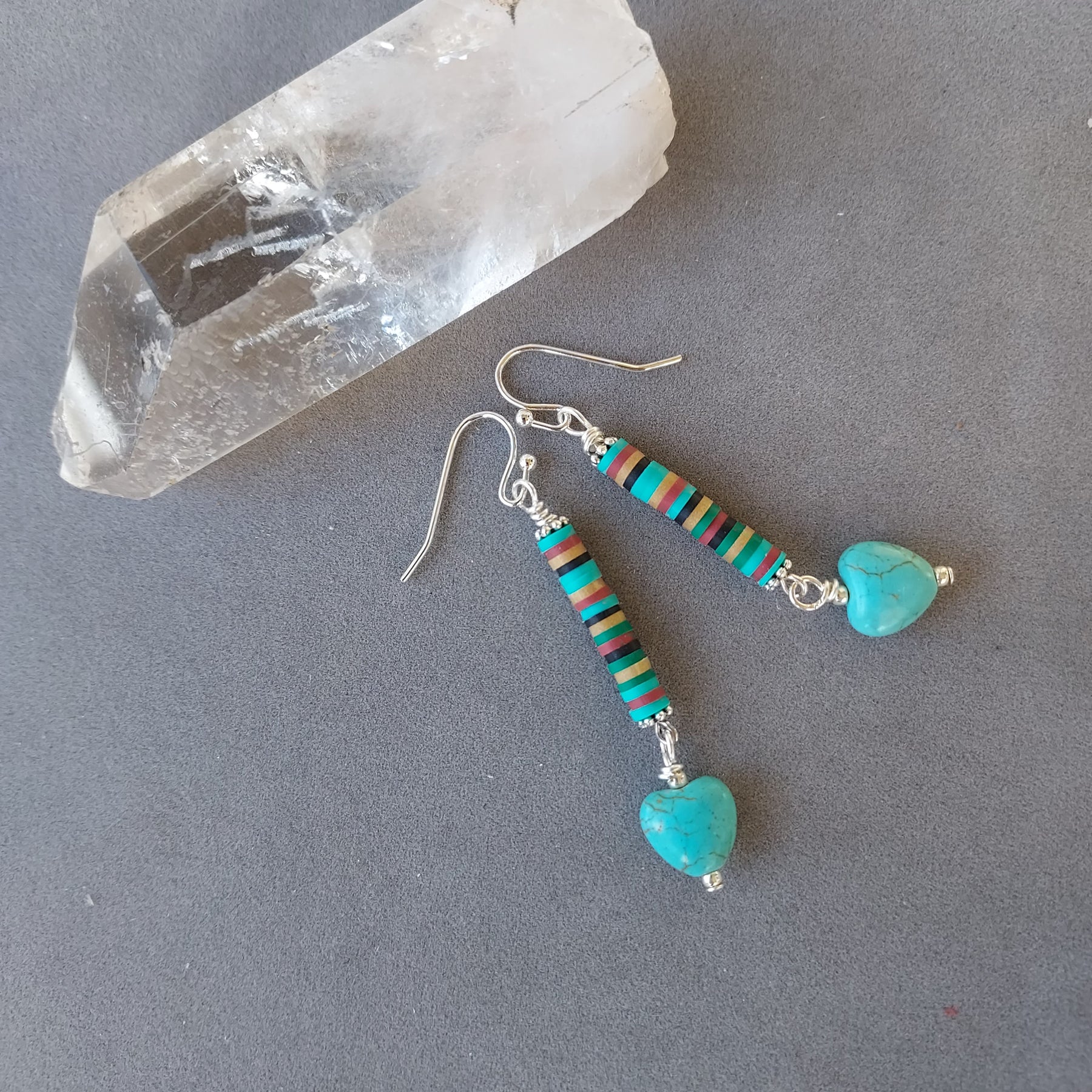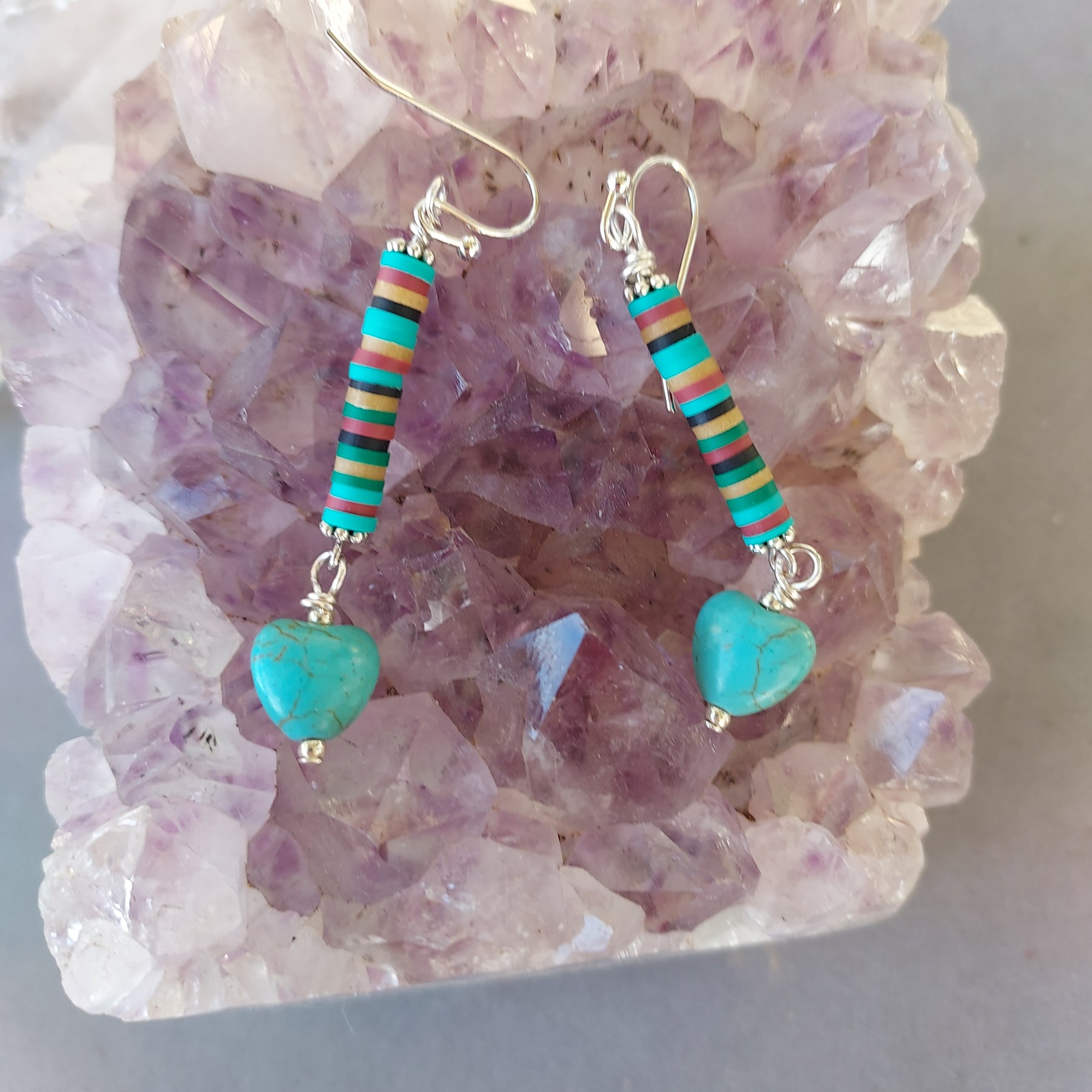Soulful and grounded, "Soul Connection" Turquoise & Clay Heishi Earrings blend earthy texture with heartfelt symbolism. Turquoise Magnesite heart beads pair beautifully with lightweight polymer clay heishi beads, creating an easygoing, artisan-made style that feels both meaningful and wearable. Finished with silver French ear wires, these earrings offer a soft pop of color and natural charm—perfect for everyday wear or thoughtful gifting.