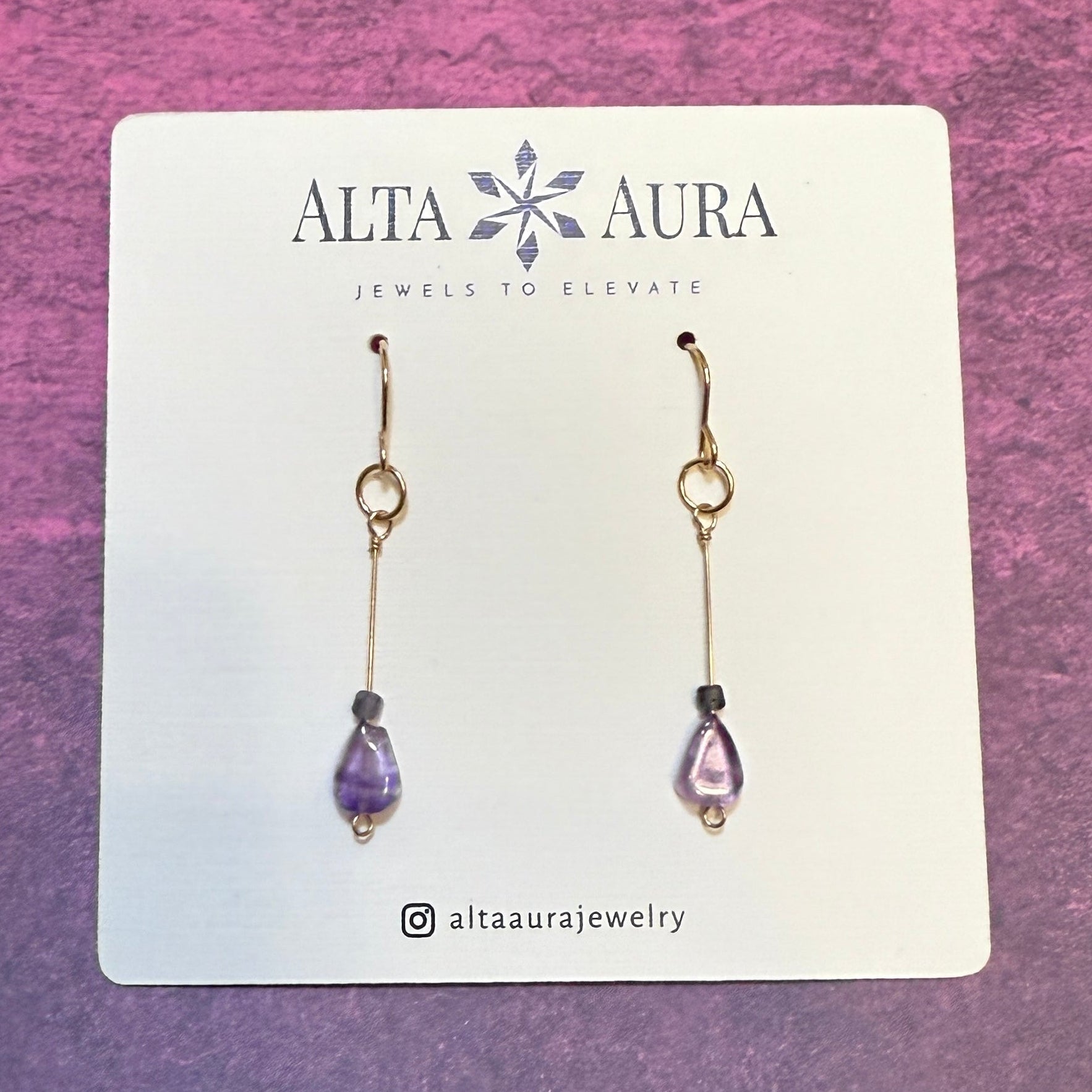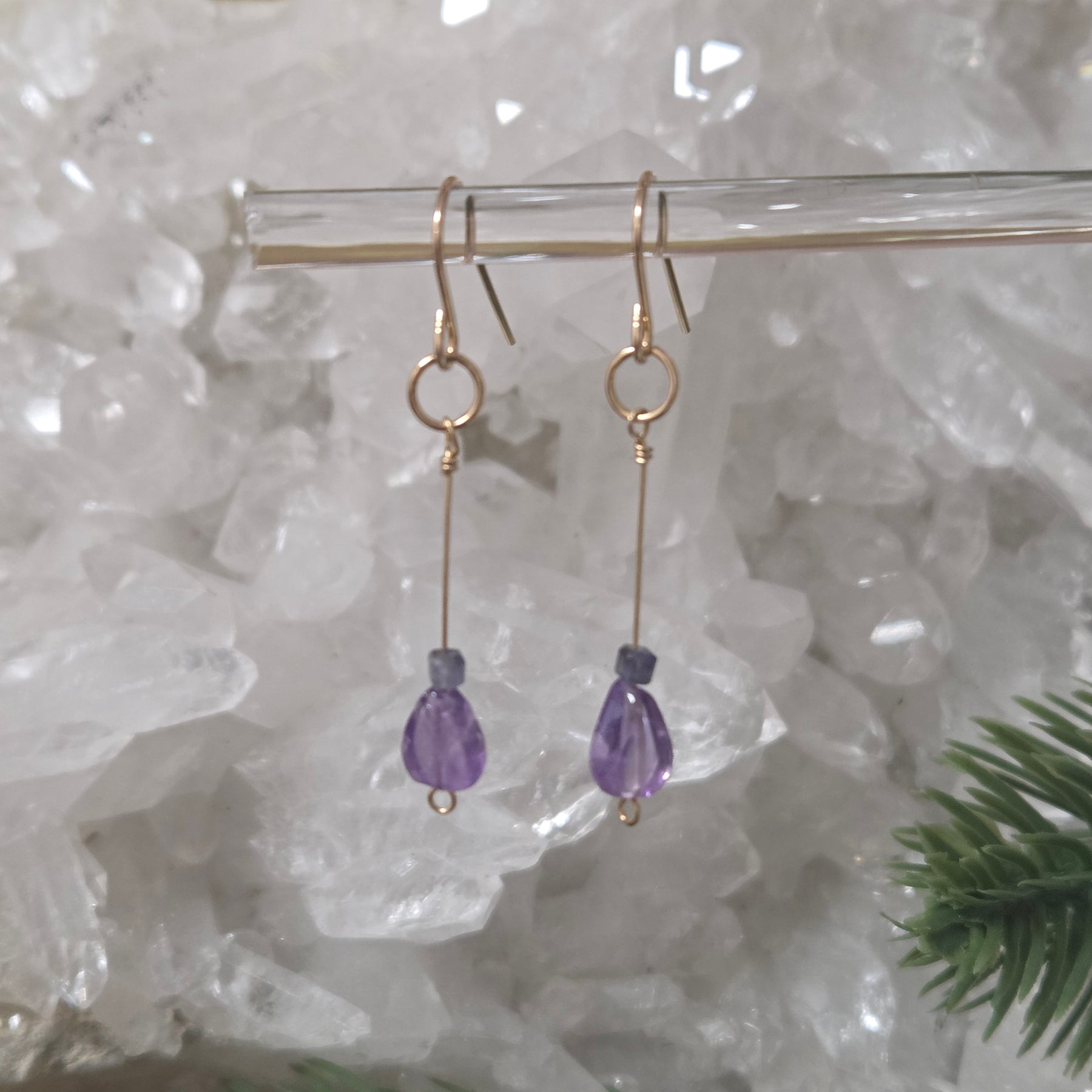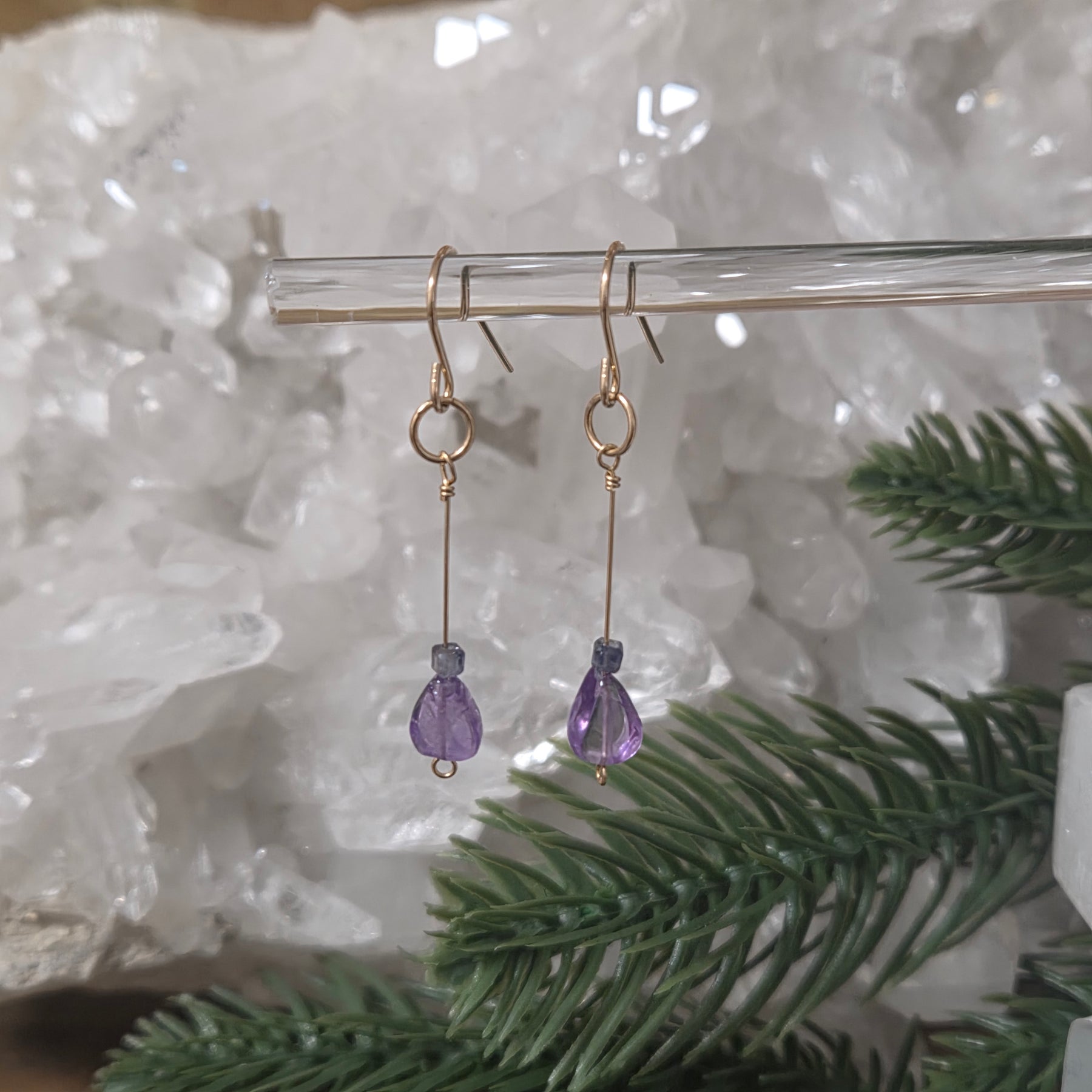 Amethyst has long been admired for its calming beauty and spiritual symbolism, while Iolite adds depth and subtle sparkle. Together, this crystal combination is believed to support intuition, inner wisdom, and spiritual insight—making these earrings a meaningful choice for everyday wear or special moments of reflection.