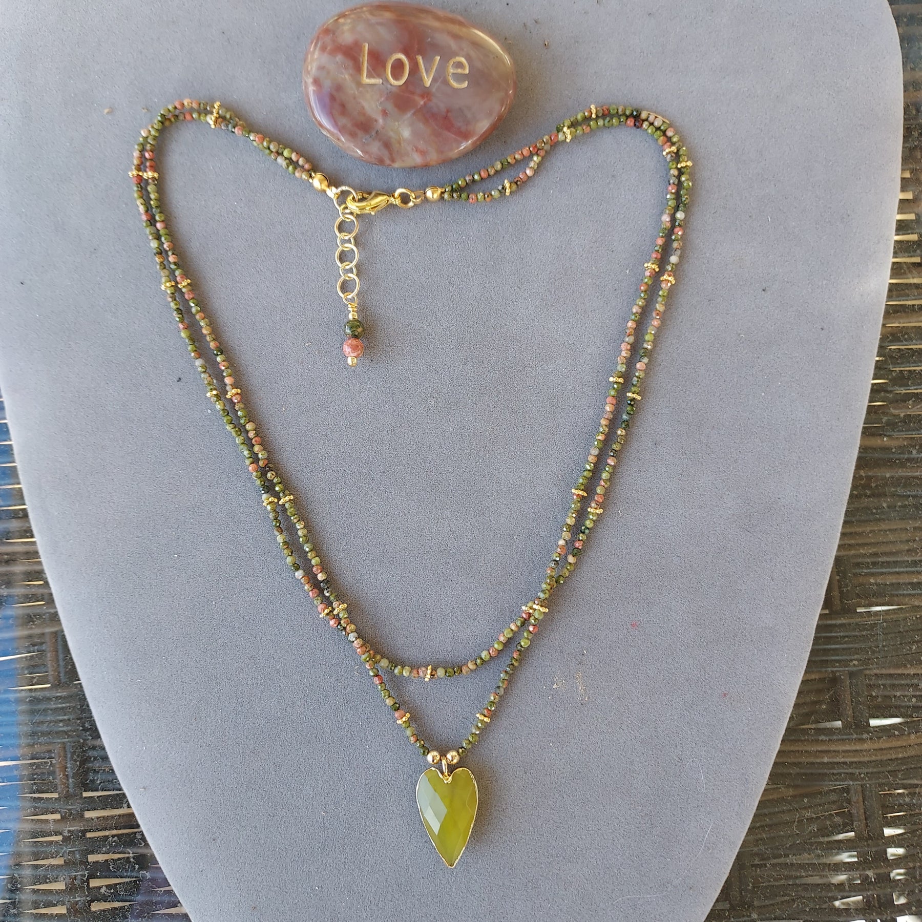 Thoughtfully layered and rich in symbolism, “Connect Heart & Mind” Unakite & Serpentine Heart Necklace features two strands of faceted Unakite rounds accented with gold-filled spacers for a soft, grounded shimmer. At the center, a faceted Green Serpentine heart set in a gold bezel creates a meaningful focal point. Finished with a gold-filled chain extender and Unakite drop accents, this artisan-made necklace offers both balance and elegant movement.